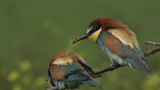 Es sind Bienenfresser, von denen es im Mindener Land tatsächlich einige wenige Brutpaare gibt. So bunt wie er ist, vermutet man ihn eher in südlichen Gefiilden. Und tatsächlich kommt er auch mehr im Süden Europas vor. 1980 galt er in Deutschland als ausgestorben, doch mittlerweile wandert er wieder ein, und es gibt in Süddeutschland und Sachsen-Anhalt wieder eine recht große Anzahl an Brutpaaren.
