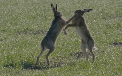 Viel Gerenne, viele Kämpfe  - so sieht das Hasenleben auf den Äckern und Wiesen im Mindener Land aus. Ein Hase versucht "sein" Weibchen zu verteidigen, während viele andere um ihre Gunst buhlen.